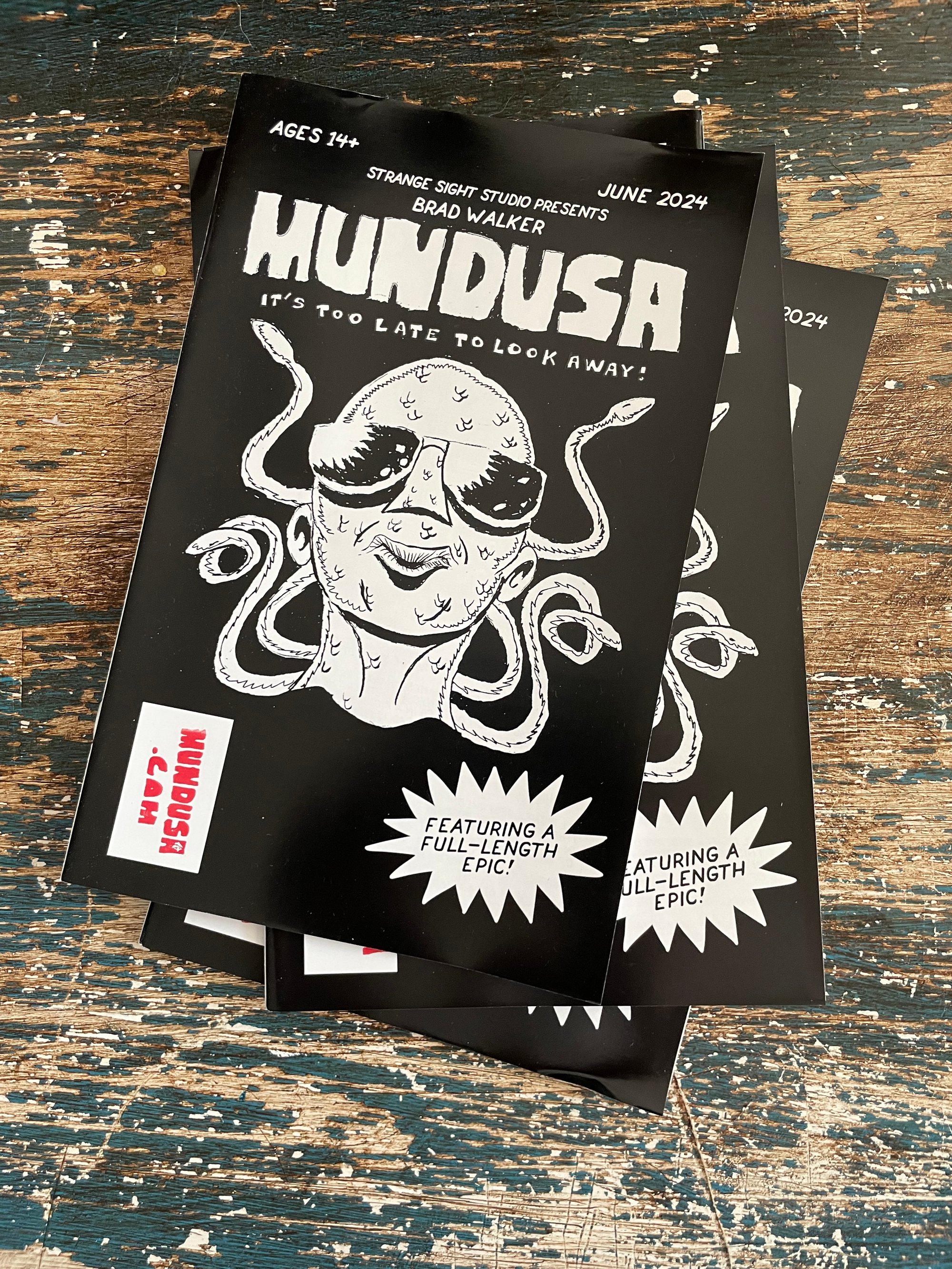 Comic book MUNDUSA #1 features the self-contained epic, "Scales of War," on luscious newsprint paper. "Scales of War" mixes Greek Mythology, military adventure, and a twist on personal hygiene. A corporate decision to dump hundreds of thousands of toxic deodorant bars into the ocean produces deadly mutants who attack the mainland. Mundusa, a mysterious mythological creature, agrees to intervene, only to come face-to-face with her evil cousin. Will it all come down to a staring contest? Pick up your copy and find out! Limited print run. First Printing. 32 pages, black and white with a glossy cover. Hand-stamped by the author. Artist and writer: Brad Walker. Editor, Letterer, and Production Assistance: Peter Merryman.