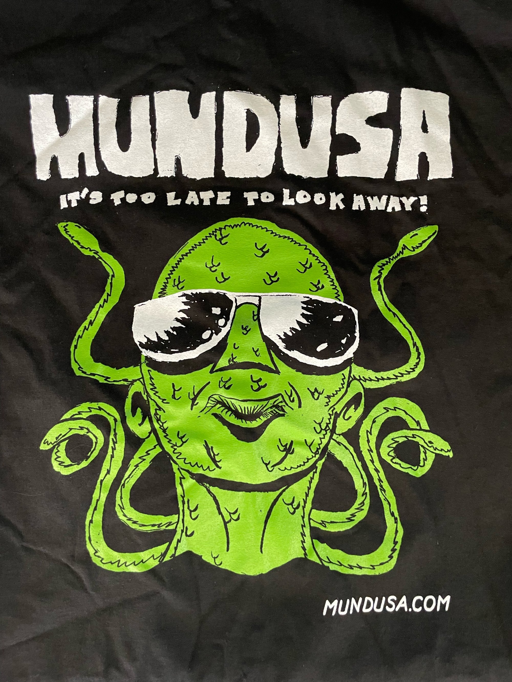 From the cover of Mundusa #1, the Medusa with a Mullet strikes a confident pose behind her shades. Black t-shirt. 100% cotton. Limited Edition of 25.